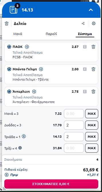 Αφού έχουμε κάνει τις επιλογές μας στους αγώνες που θα στοιχηματίσουμε απόψε, τότε πρέπει να διαμορφώσουμε και όλο το σύστημα. Στην κάτω πλευρά του δελτίου μας βλέπουμε τρία κουτάκια. Για παράδειγμα, βάζουμε 2 ευρώ στις δυάδες και 2 ευρώ στην τριάδα. Τι σημαίνει αυτό; ότι θα ποντάρουμε 8 ευρώ συνολικά. 2 ευρώ επί τρεις δυάδες και 2 ευρώ στην μία τριάδα.