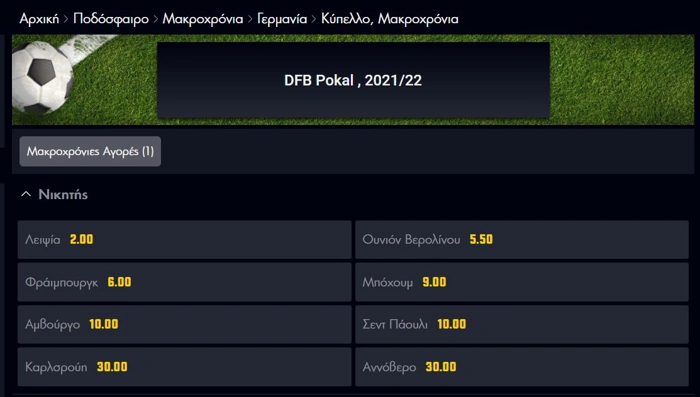 Η κλήρωση για την προημιτελική φάση του DFB Pokal δεν έχει γίνει ακόμη, οπότε, είστε ελεύθεροι να ποντάρετε σε αποδόσεις νικητή του θεσμού, χωρίς περισπασμούς. Αξίζει να σημειωθεί, τέλος, ότι