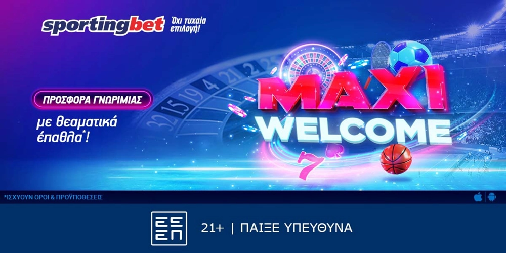 Το παιχνίδι σου έχει αφετηρία την Sportingbet και με την Maxi Προσφορά* Γνωριμίας, που μοιράζει σούπερ έπαθλα*, θα… παίξεις μεγάλη μπάλα! Maxi… διασκέδαση, λοιπόν, με… maxi καλωσόρισμα. Μόνο στην Sportingbet. Εδώ, που ο κόσμος του αθλητισμού σε υποδέχεται με κορυφαίο live στοίχημα, χιλιάδες αγορές, ακόμα περισσότερα ειδικά παικτών και κορυφαίες λειτουργίες.