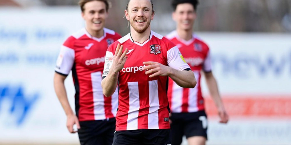 Η Έξετερ νίκησε 2-0 εντός έδρας τη Ρότσντεϊλ το Σάββατο για την 44η αγωνιστική της League Two Αγγλίας και απέχει πλέον τρεις βαθμούς από την άνοδο στη League One. Προηγήθηκε με τον χαφ Ντιένγκ στο 34' και σφράγισε την επικράτησή της με τον επιθετικό Τζέι (φωτογραφία) στο 60'. Είχε 45% κατοχή μπάλας και 14 τελικές προσπάθειες. Μετράει μόλις μία ήττα στα 11 τελευταία παιχνίδια της στην κατηγορία (8 νίκες, 2 ισοπαλίες και μία ήττα). Στα 7 από τα 11 αυτά ματς διατήρησε απαραβίαστη την εστία της.